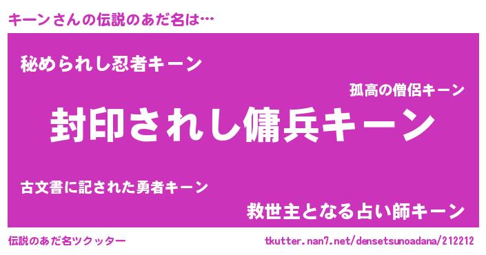 | 男性向けラノベタイトル風あだ名 | 『キーンに滅ぼされるだけの簡単なお仕事です』 |