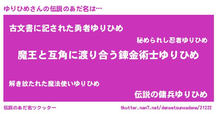 | 男性向けラノベタイトル風あだ名 | 『転生したらゆりひめだった件』 |