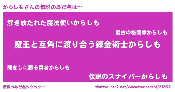 | ヒーロー風カッコイイあだ名 | 『仮面カラダー』『天空の使者からしも』 |