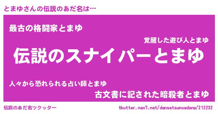 | ヒーロー風カッコイイあだ名 | 『スーパートマユ』『ウルトラとまゆマン』 |
