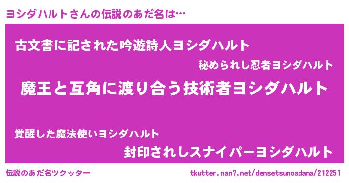| ヒーロー風カッコイイあだ名 | 『愛の使者ヨシダハルト』『仮面ヨシダー』 |