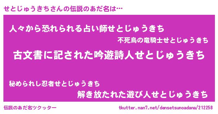 | ヘコむあだ名 | 『せとじゅうきち(小並感)』『せとっ子』 |