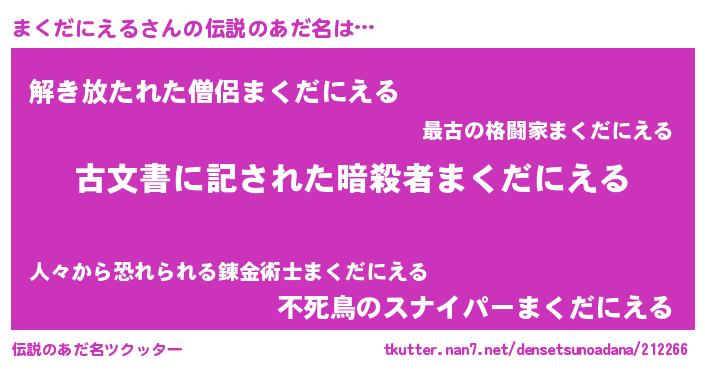 | 胡散臭い通販商品みたいなあだ名 | 『前代未聞の健康食品…その名も「まくだにえる」』 |
