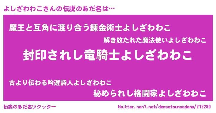 | 男性向けラノベタイトル風あだ名 | 『ヨシザワワコアートオンライン』 |