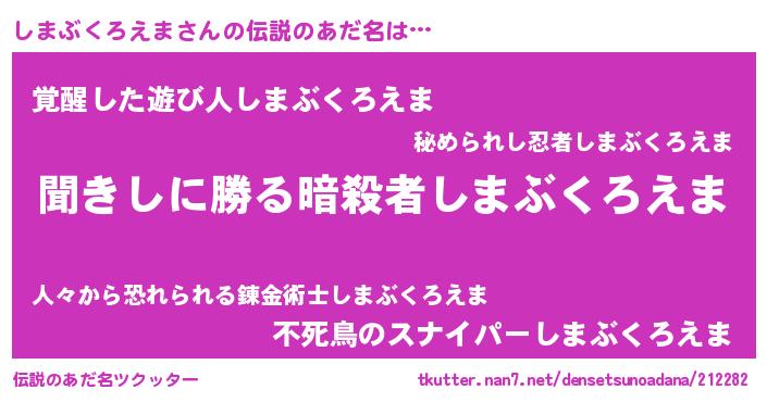 | 男性向けラノベタイトル風あだ名 | 『魔弾の王としまぶくろえま』 |
