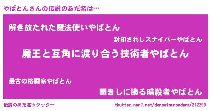 | 料理風あだ名 | 『やばとんごはん』『やばとんのトマト煮』 |