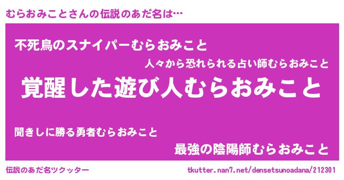 | 男性向けラノベタイトル風あだ名 | 『むらおみことの嫁は女の子じゃないと思った?』 |