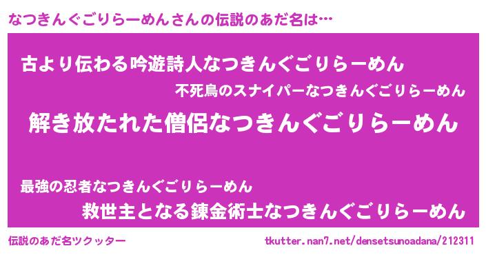 | 女子向けラノベタイトル風あだ名 | 『なつきんぐごりらーめんの卵を拾いまして』 |