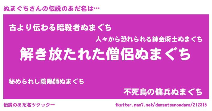 | 意味不明あだ名 | 『とにかく怪しいぬまぐち』 |