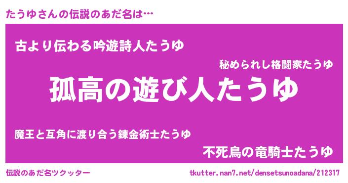 | 意味不明あだ名 | 『住所不定無職たうゆ(98歳)』 |