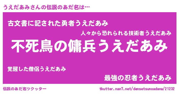 | ヘコむあだ名 | 『うえにゅー』『うえだあみ(遠い目)』 |