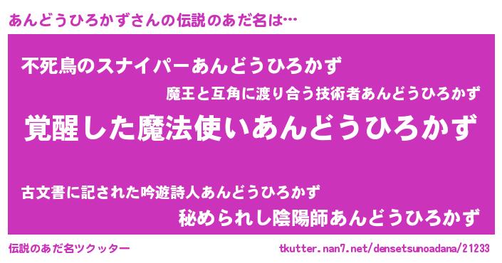 | 男性向けラノベタイトル風あだ名 | 『あんどうひろかずの嫁は女の子じゃないと思った?』 |