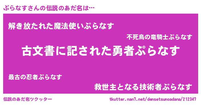 | ヘコむあだ名 | 『ぷらなす(震え声)』『ぷらを』 |