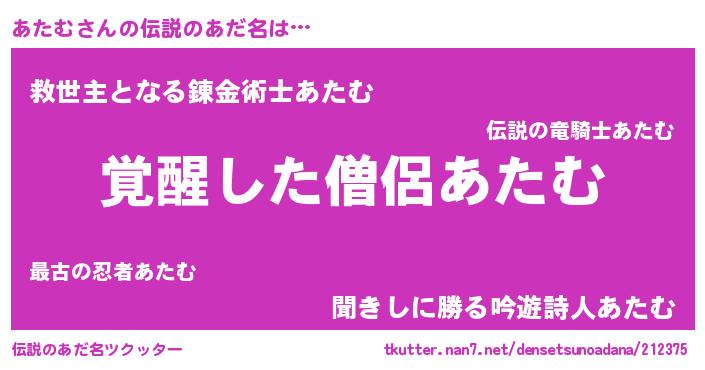 | 男性向けラノベタイトル風あだ名 | 『Re:あたむから始める異世界生活』 |
