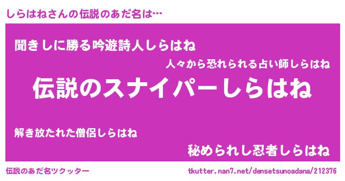 | 意味不明あだ名 | 『ペロリンしらはね』『永久保存しらはね』 |