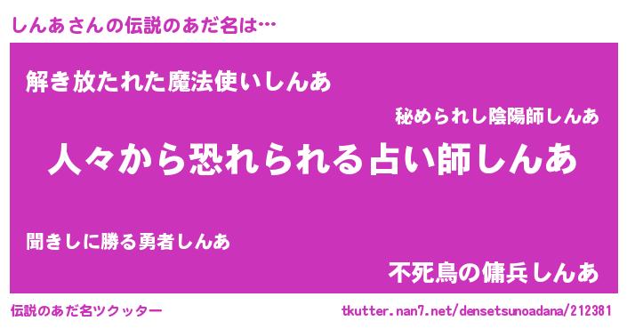 | ヒーロー風カッコイイあだ名 | 『正義の使者しんあ』『仮面シンダー』 |