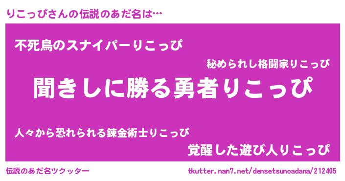 | 女子向けラノベタイトル風あだ名 | 『異世界で失敗しない100のりこっぴ』 |