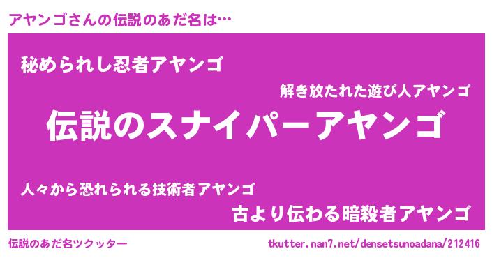 | 意味不明あだ名 | 『ペロリンアヤンゴ』『自称アヤンゴ』 |