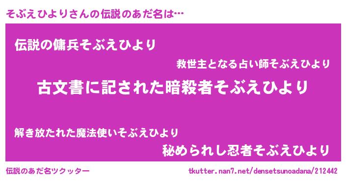 | 男性向けラノベタイトル風あだ名 | 『そぶえひより~年齢イコール彼女いない歴の魔法使い~』 |
