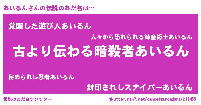 | 女子向けラノベタイトル風あだ名 | 『闇のあいるん』『あいるん様がみてる』 |