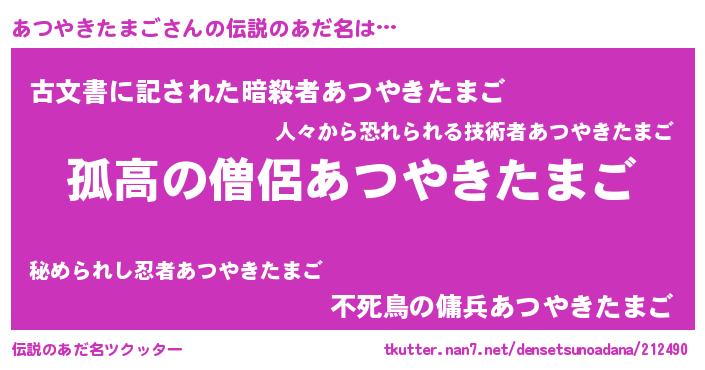 | 胡散臭い通販商品みたいなあだ名 | 『信頼と実績のネックレス…その名も「あつやきたまご」』 |