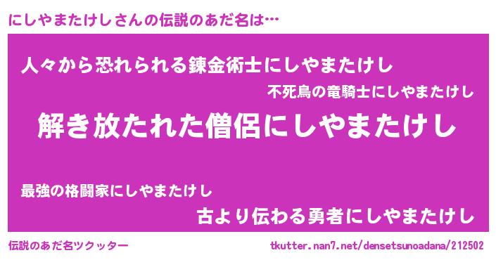 | ポケモン風あだ名 | 『ニシキング』『ヒニシヤマタケシ』 |