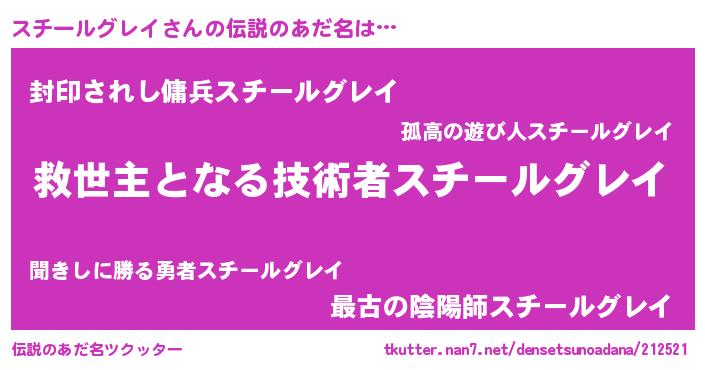 | 胡散臭い通販商品みたいなあだ名 | 『あなたにだけ特別に提供する100年もののヴィンテージワイン…その名も「スチールグレイ」』 |