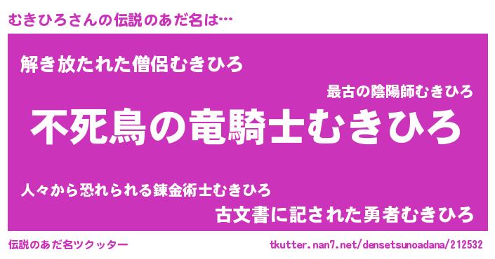 | 男性向けラノベタイトル風あだ名 | 『Re:むきひろから始める異世界生活』 |