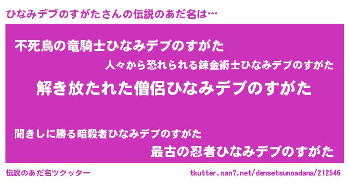 | 男性向けラノベタイトル風あだ名 | 『この素晴らしい世界にひなみデブのすがたを!』 |