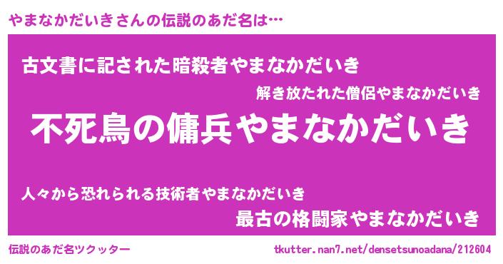 | 女子向けラノベタイトル風あだ名 | 『やまなかだいき姫と円卓の騎士』 |