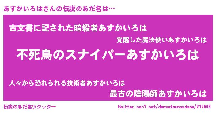 | 男性向けラノベタイトル風あだ名 | 『転生したらあすかいろはだった件』 |