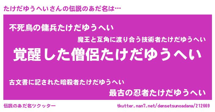 | 男性向けラノベタイトル風あだ名 | 『たけだゆうへいの嫁は女の子じゃないと思った?』 |