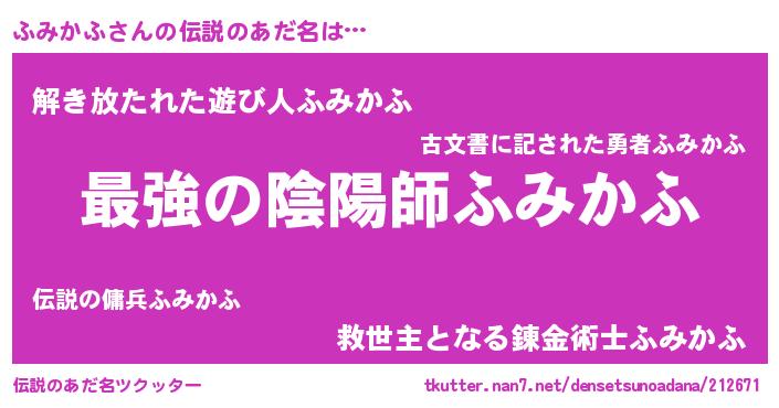 | 男性向けラノベタイトル風あだ名 | 『うちの娘の為ならば、俺はもしかしたらふみかふも倒せるかもしれない。』 |