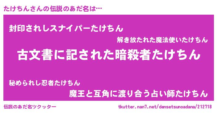 | ヘコむあだ名 | 『たけちん(爆)』『たけっふぃ~』 |
