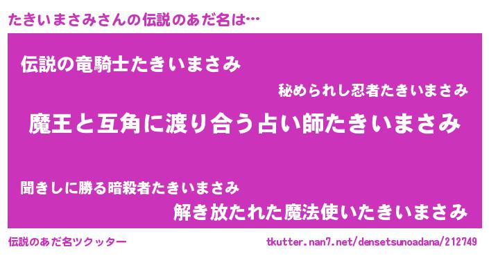 | 男性向けラノベタイトル風あだ名 | 『転生したらたきいまさみだった件』 |