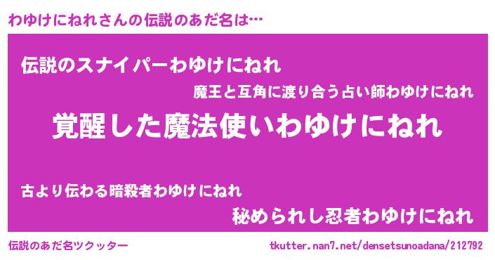 | ポケモン風あだ名 | 『ヒワユケニネレ』『ワユチュウ』 |