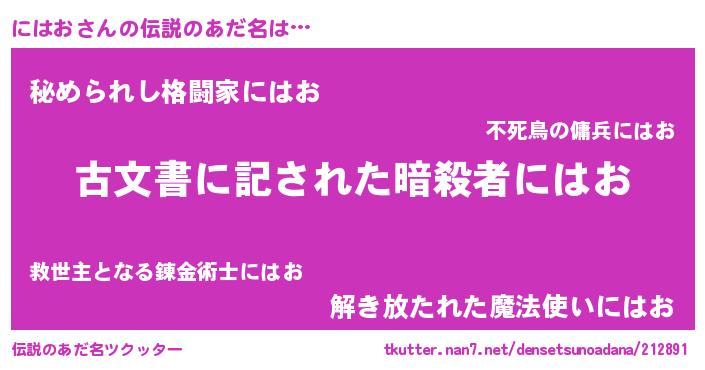 | 男性向けラノベタイトル風あだ名 | 『にはおに滅ぼされるだけの簡単なお仕事です』 |