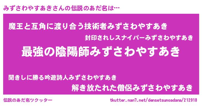 | 意味不明あだ名 | 『みずさわやすあきフォーエバー』 |