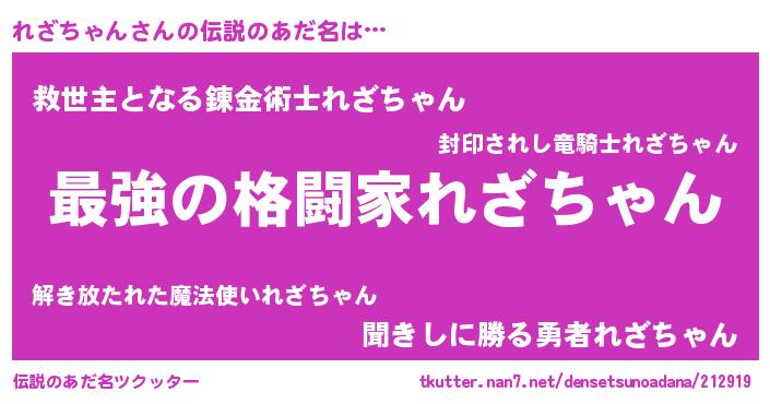 | 男性向けラノベタイトル風あだ名 | 『れざちゃん~年齢イコール彼女いない歴の魔法使い~』 |