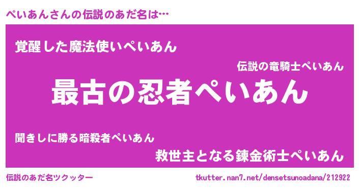 | 意味不明あだ名 | 『ぺいあんフォーエバー』『自称ぺいあん』 |