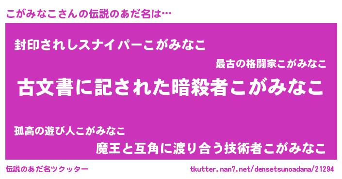 | 意味不明あだ名 | 『自称こがみなこ』『永久保存こがみなこ』 |