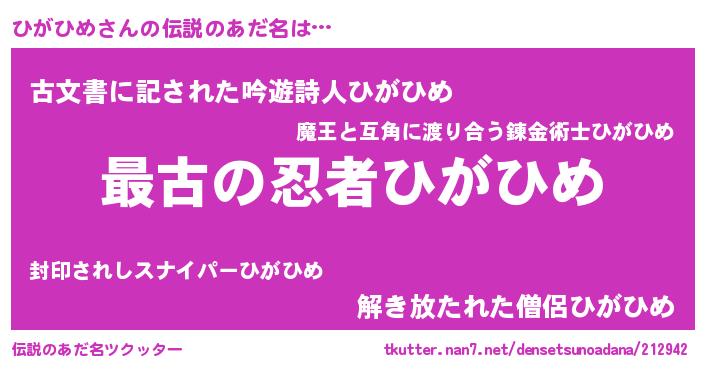 | ヒーロー風カッコイイあだ名 | 『ウルトラひがひめマン』『ネオヒガヒメ』 |