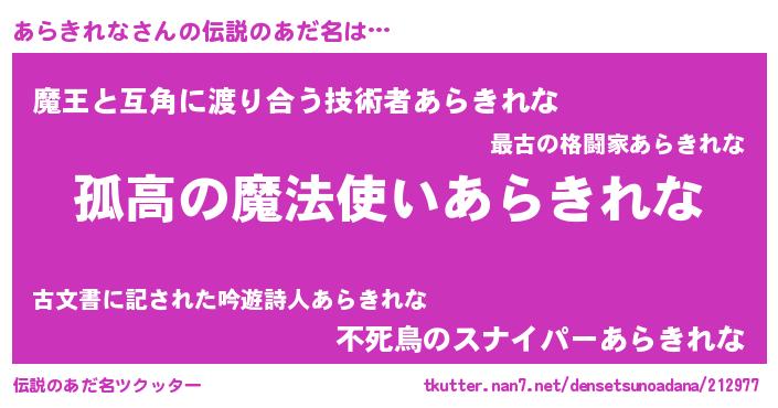 | 女子向けラノベタイトル風あだ名 | 『あらきれなは平凡を望む』 |