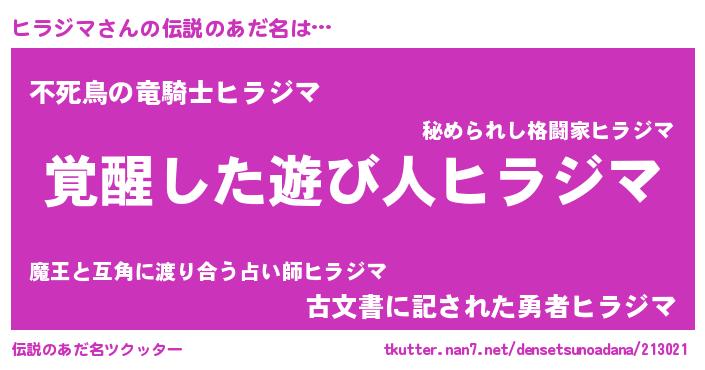 | ヒーロー風カッコイイあだ名 | 『究極戦士ヒラジマ』『魔戒騎士ヒラ』 |