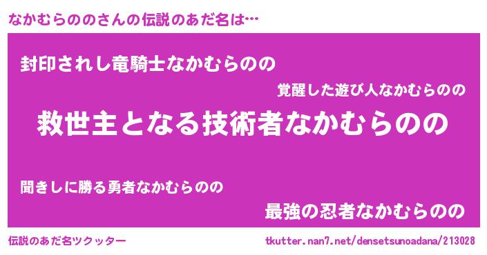 | 男性向けラノベタイトル風あだ名 | 『ノーゲーム・ノーナカムラノノ』 |