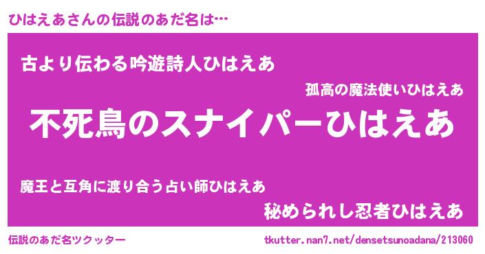 | ヘコむあだ名 | 『ひはっふぃ~』『ひはえあ(小並感)』 |