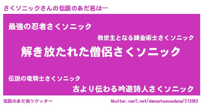 | 女子向けラノベタイトル風あだ名 | 『さくソニックの卵を拾いまして』 |