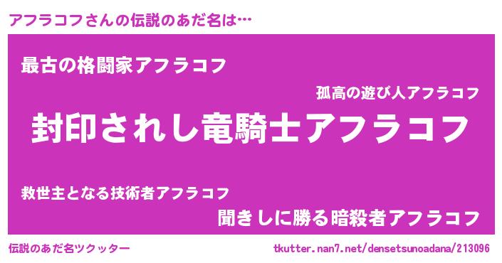 | 男性向けラノベタイトル風あだ名 | 『アフラコフ~年齢イコール彼女いない歴の魔法使い~』 |