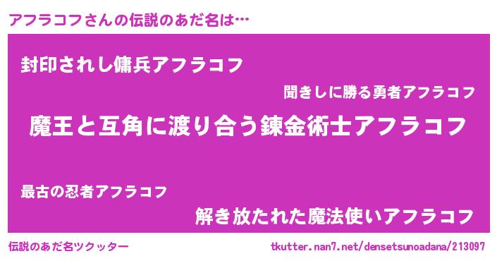 | ヒーロー風カッコイイあだ名 | 『仮面アフダー』『慈愛の使者アフラコフ』 |