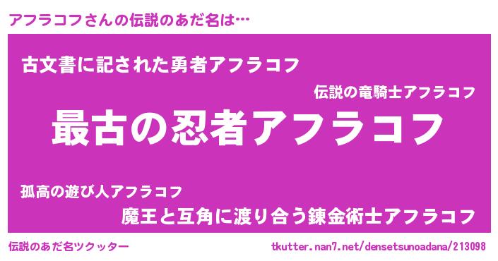 | 意味不明あだ名 | 『自称アフラコフ』『永久保存アフラコフ』 |